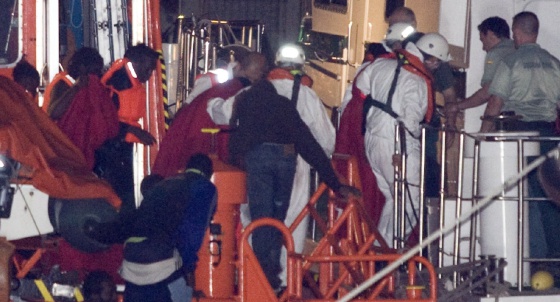 Llegada a tierra de los inmigrantes durante la noche del miércoles. / C. B. (EFE)