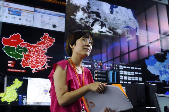 Para comprender la efervescencia con la que se mueve el dinero en el ciberespacio chino basta una mirada rápida a la gigantesca pantalla de control en la que se muestra la actividad de los diferentes portales del grupo Alibaba. Miles de puntos destellan por toda la geografía del Gran Dragón, sobre todo en la costa este, y un mapamundi gira en el centro de la pared LED mostrando algunas de las consultas y adquisiciones de usuarios extranjeros. “Visitante de Mumbai, India, busca generadores diésel”. España todavía duerme y aparece como una mancha oscura, pero en América todavía no se han ido a la cama. “Visitante de Littleton, Estados Unidos, busca válvulas para cocinas de gas”. La fábrica del mundo no descansa.