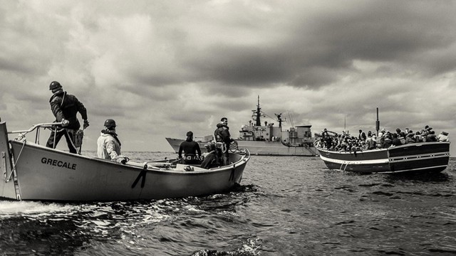 La tarde anterior el horizonte se había teñido de sangre sobre un Mediterráneo liso y manso. Pero oscuro. Un mal presagio. De que algo iba a ocurrir. Las condiciones eran muy favorables para la navegación. Si uno estuviera en Libia, aguardando a zarpar en una patera para dejar atrás la guerra o la miseria, sería el momento perfecto para lanzarse a lo desconocido. Rumbo a Europa. O al fondo del mar. Y así lo comentamos esa noche en el diminuto camarote que amablemente nos había cedido el comandante de la fragata italiana Grecale, Stefano Frumento. Yo en la litera de arriba, Carlos Spottorno en la de abajo; o quizá él estuviera editando fotos sobre el diminuto escritorio de la estancia, como suele hacer cuando trabaja: hasta bien entrada la madrugada. Era nuestra tercera noche entre marinos italianos destinados al agujero negro del drama migratorio. Nos encontrábamos en algún punto entre África y Europa. La mayor brecha del mundo. La más desesperada. Cerca de 22.000 personas han muerto a las puertas de nuestro continente desde el año 2000. La mayor parte de ellas se hundieron en el pozo sobre el que patrullábamos a bordo de la Grecale, una de las naves militares del dispositivo Mare Nostrum que el ministerio de Defensa italiano había desplegado en aguas internacionales para evitar una nueva tragedia como la de Lampedusa, en la que se ahogaron cerca de 400 inmigrantes.